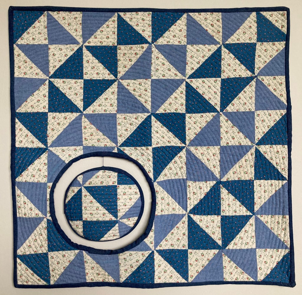 Abstract fiber art built on a foundation of traditional quilt blocks.